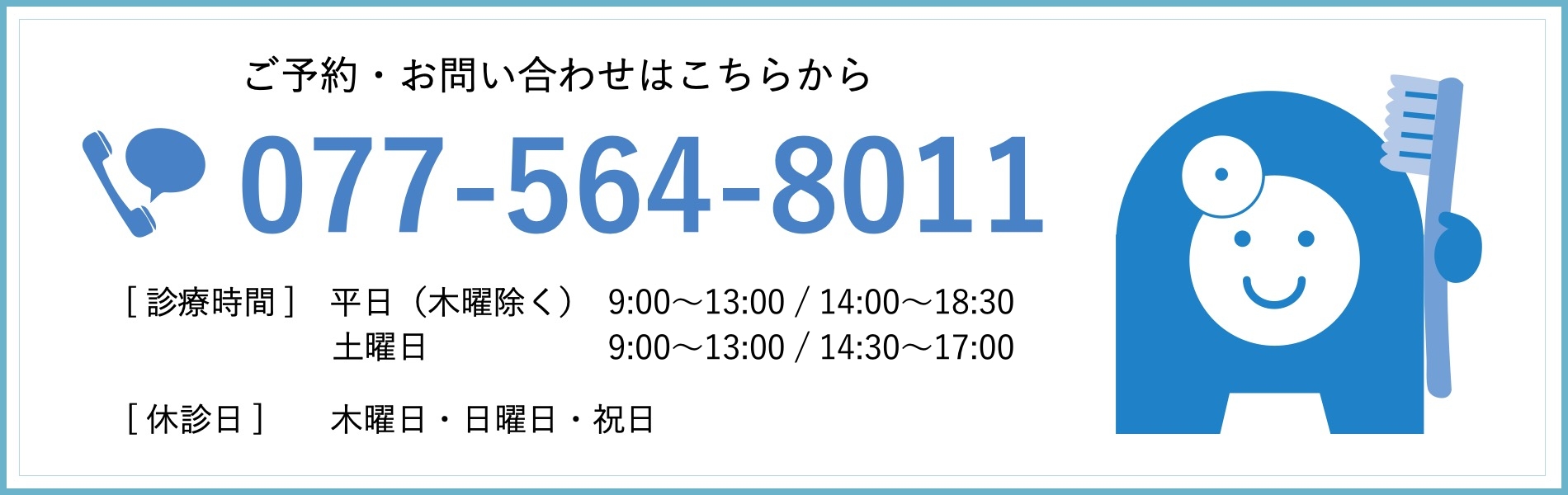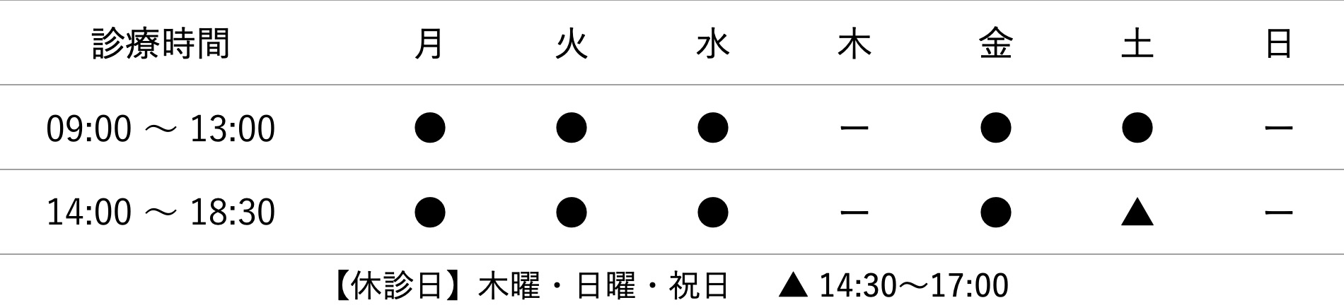 平日は9時から18時30分まで(木曜日除く)、土曜日は9時から17時まで診療しておりますので、通勤通学やお出かけ時に合わせて通院いただけます。
